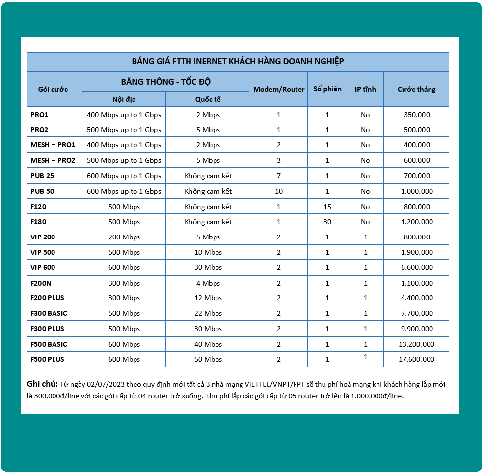 Ghi chú: Từ ngày 02/07/2023 theo quy định mới tất cả 3 nhà mạng VIETTEL / VNPT / FPT sẽ thu phí hoà mạng khi khách hàng lắp mới là 300.000đ/line với các gói cấp từ 04 router trở xuống, thu phí lắp các gói cấp từ 05 router trở lên là 1.000.000đ/line.