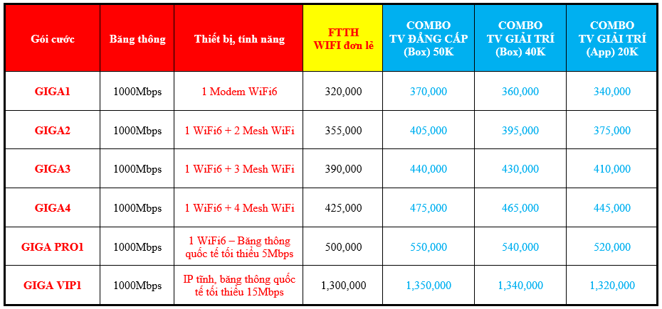 Ghi chú: Từ ngày 02/07/2023 theo quy định mới tất cả 3 nhà mạng VIETTEL / VNPT / FPT sẽ thu phí hoà mạng khi khách hàng lắp mới là: 500.000đ/line GIGAxx